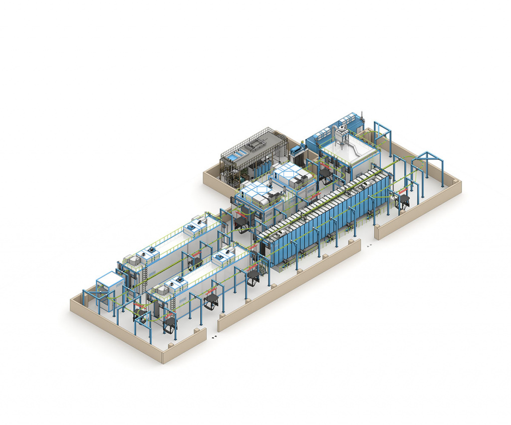 - Ручной монорельсовый конвейер SPK-CS.ОММ с четырьмя элеваторами для загрузки и выгрузки изделий и автоматическими протяжками в зоне АХПП, камерах сушки и зоне охлаждения